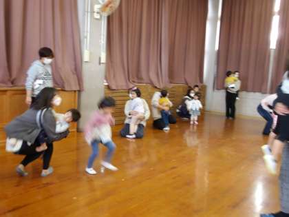3歳児は手遊び、踊り、最後はお家の方とふれあい遊びをしました。並んで手遊びをするときは緊張した表情でしたが、踊りで走ったり跳んだりして緊張がほぐれ、お家の方に抱っこやおんぶをしてもらって笑顔が見られました。