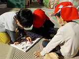 「だんご虫も仲間に入れてあげようよ」と、今日は、ダンゴムシも探しに行きました。「何しているの?」と興味をもったちゅうりっぷ組さんも一緒に、プランターを移動さすと・・・、「何か、へんなものがいる!」茶色の塊で、先っぽが動いています。子どもたちと図鑑で調べてみると、「これじゃない?」「形が似ているね」「ほら、先の方も同じ形!」「これ、さなぎって書いてある!」「これが、これになるってこと?」と、子どもたちは、大興奮!蛾のさなぎだったようです。土の中には、いろいろな生き物がいることを、改めて感じたひと時でした。