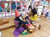 たんぽぽ組の子どもたちは、お人形に名前をつけて、ベッドに寝かせ、お世話をしています。「サンタさんが来てくれるからね〜。いい子に寝てるんだよ。」と、ぬいぐるみをなでて…。きっと、お家の人にしてもらっているのでしょうね。とってもかわいらしい姿でした。