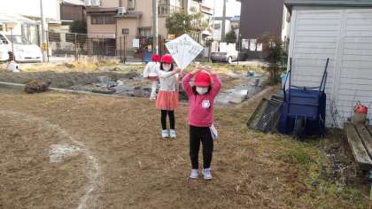 5歳児すみれ組が、凧をつくって遊んでいます。