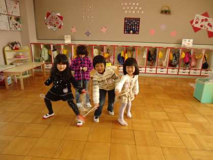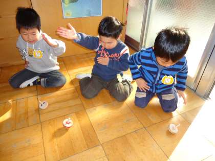 「あけましておめでとうございます!」と元気よく子どもたちが登園してきました。今日からいよいよ3学期がスタートしました。始業式で園長先生から「3学期が終わったらひとつずつ大きい学年になるから,頑張ってね」と言われ,嬉しそうな恥ずかしそうな表情の子どもたちでした。そしてお年玉のプレゼントをいただきました。5歳児は紐ゴマ,4歳児は横立ちゴマ3歳児は手回しゴマでした。式が終わるとさっそくお年玉のコマで遊んだりお正月あそびを楽しんだりしました。久しぶりの幼稚園,久しぶりの友達に出会い嬉しい1日になりました。あさっては餅つきです。明日は5歳児が30キロの餅米を洗い,餅つきの準備をします。楽しみです。