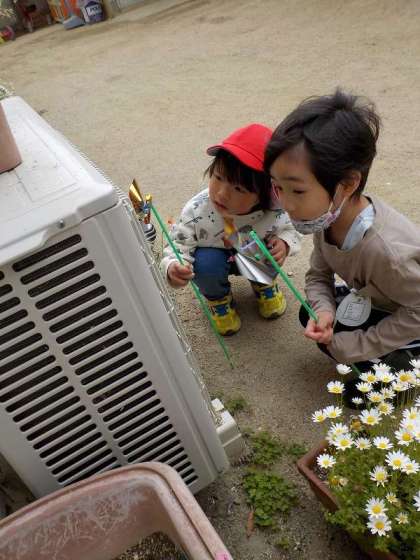 すると、園庭の隅にあるエアコンの室外機の前に風車を向けている子どもが…