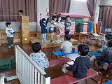 今日は、遊戯室で大積木を使って舞台をつくり、映画館ごっこが始まりました。