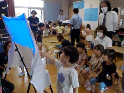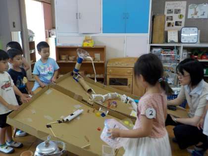6月末、科学センターに行った5歳児すみれ組が、自分たちの科学センター「すみれセンター」を作りました。プラネタリウム、影絵クイズ、恐竜、玉転がしのコーナーがありました。