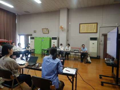 子どもたちが帰った後、先生たちで、すみれ組の子どもたちが意欲的に遊んでいる姿を出し合い、研修しました。幼稚園で育った力が、学校でも発揮されるよう、互いの教育について理解を図っています。