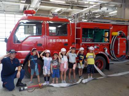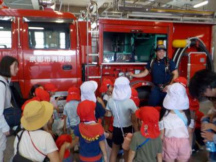 今日は、伏見消防署に消防車を見せてもらいに行きました。3歳児は、園外に出るのは、初めてです。年長・年中組のお兄さん・お姉さんに手をつないでもらいながら、消防署まで歩いていきました。