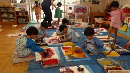 久しぶりの幼稚園での絵の具遊びで、消防車をかいた後、手足に絵の具をつけたりして遊ぶ姿も見られました。