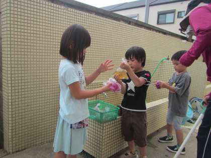 「何しているの?」と興味をもった3歳児さんにも、優しくやり方を教えて一緒に楽しみました。