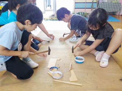 金づちを使って、板に釘をたくさん打つことを楽しんだり、板と板を釘でつなげたりしています。こんなものをつくりたいという思いより、ただ釘を打つことを楽しむ姿もあります。
