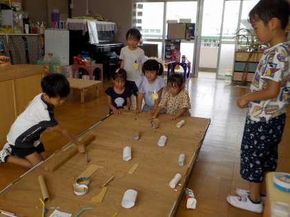 「そうや、これをつなげて大きいのをつくったら面白いんじゃない!」というので、子どもたちと新しいビー玉転がしをつくることをしました。クラスのみんなで釘を打ったり、ビー玉が落ちないように板の周りにストローや木を張り巡らせてガードしたり、板やトイレットペーパの芯などでいろんなコースやトンネルをつくったり…。