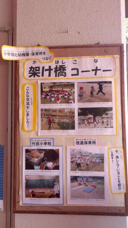 交流の様子や、小学校や保育所の友達の様子を子どもや保護者の方にも知っていただきたいと願い、「架け橋コーナー」を作りました。