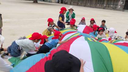 5歳児と4歳児がいっしょにパラバルーンで遊んでいます。