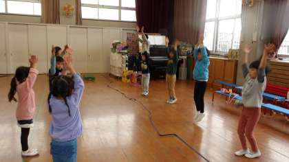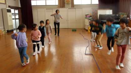 運動会の時のように、年長児が前に出て先生役、年中児はまねをして踊りました。