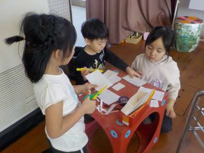 昨日のポップコーンパーティの中で、ポップコーンを食べながら観ることができたショーの舞台を使って、今日もショーをしようと、5歳児の子どもたちが、チケットを作り始めました。