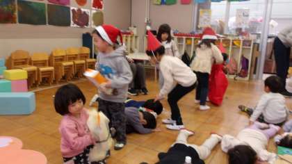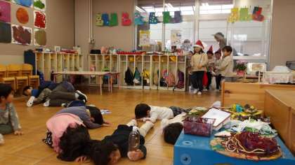 プレゼントを持ってってちゅうりっぷ組に行くと、寝ていない子どもたちがいました。サンタさんが「寝てくださーい」と言うと、子どもたちはすぐに床に寝ころびました。