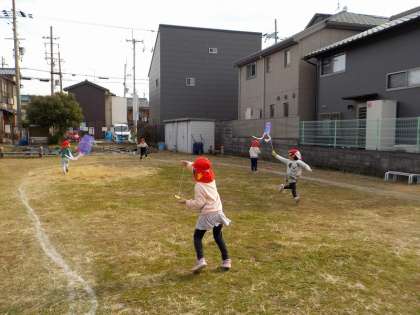 4歳児たんぽぽ組は、ビニール凧をつくって遊びました。