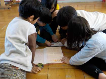以前、魔女から手紙をもらったことのある子どもたちは、「もしかして、魔女の手紙?」と、期待をもって見ると…、「あれ?なんて書いてあるの?」暗号のような文字で、読めません。「もしかして、魔女にしか読め合い文字なのかな?」「そういえば、この間読んだ絵本に魔女の文字が書いてあったよね?それで見てみようよ」ということで、すみれ組の子どもたちで、魔女の文字を解読です。