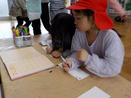 次の日、魔女文字のあいうえお表を使って、自分の名前を書くことを楽しんでいた子どもたち。不思議な名札が出来上がりました。