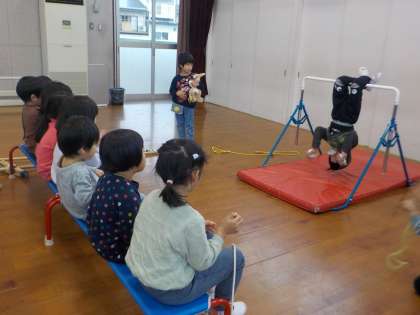 鉄棒にぶら下がり、逆さのまま楽器を鳴らす「こうもり楽器」、あやとりのマジック「まほうのほうき」、縄跳びもあります。