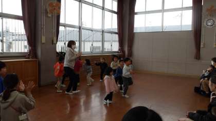 4歳児は「おでんぐつぐつ体操」3歳児は手遊び「パンダ うさぎ コアラ」、5歳児は「なべなべそこぬけ」を新入園児さんと一緒にしました。
