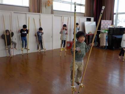 乗れるようになってきた二学期の頃には、乗ることに必死だった子どもたちも、今は余裕ができたきたようで、友達と高さの違う竹馬を交換したり、「競争しよう」と誘ったりして、竹馬に乗ることを楽しんでいました。