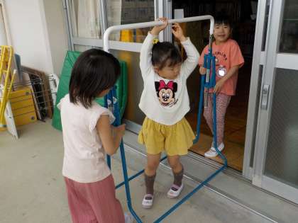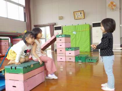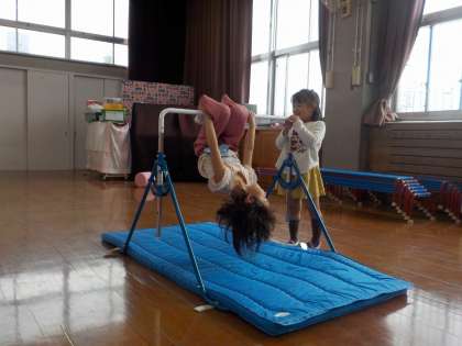 遊戯室で巧技台を出して,遊ぶ場所をつくることにしました。まず作りたいとなったのが滑り台。しばらく作った滑り台で遊んでいると,「鉄棒やりたいな〜」と言い始めたAちゃん。「こっちにあるんやで」と,片付けてある部屋まで連れていってくれ,自分たちで用意し始めました。マットを敷いて遊び始めると,今度は「さかあがりしたいな」とBちゃん。すると,それを聞いたAちゃんは,逆上がりするために,補助台をつくることを思いついたようでした。「何をつかったらできるかな?」と用具を見ていると,踏切板を組み合わせればできるのでは?ということに気づきました。ピンクの台を一つ持っていっては「まだなんか低い…」もう一つ持っていって,「これやったらちょうどいいかも!」友達と一緒に運んで,満足のいくものができました。早速逆上がりをしてみると,思うようにいかない部分もありました。それでも,自分たたちでつくった踏切板を使ってやる時間が楽しそうでもありました。