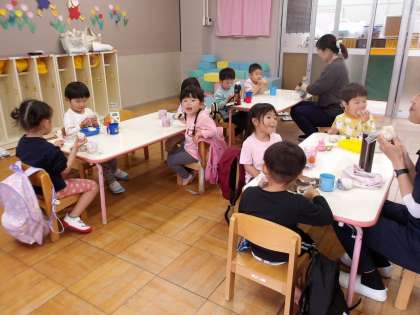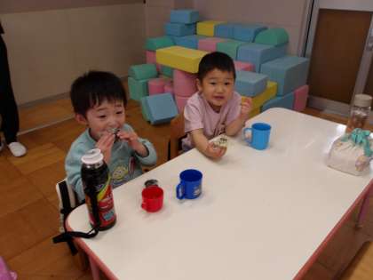 今日は、ちゅうりっぷ組の子どもたちのはじめてのおにぎり弁当でした。朝から嬉しそうに、「おにぎりもってきたよ」「ママがつくってくれた!」とお弁当袋を見せてくれました。お昼が近づいてくると、「おにぎり食べよう!」「早く食べたい!」と、食べることを楽しみにしながら準備をして、みんなで「いただきます」をしました。
