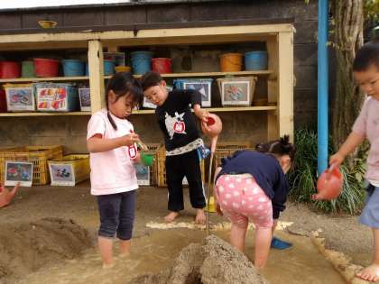 砂場に水がたまっていることに気が付いたAちゃんが、裸足いなって水たまりに入ると、「冷たい!」と、とても楽しそう。その声に誘われて、他の子どもたちも裸足になって、水の中に入っていきます。その度に、「冷たい!」と同じように声をあげます。