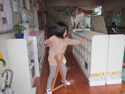 今年度は、異年齢での交流として、幼稚園家族のグループをつくっています。先週、幼稚園家族の5歳児すみれ組の子どもたちと出会った4歳児たんぽぽ組の子どもたち。一緒に弁当を食べたり、こおり鬼やすみれ組の保育室で一緒に遊んだりと楽しい時間を過ごしました。その中で、三角馬を教えてもらった子どもたち。「三角馬に乗りたい!」「やってみたい」とたんぽぽ組で毎日挑戦しています。先生に支えてもらったり、自分で支えにつかまって歩いてみたりしています。三角馬に両足を乗せ、一歩、前に進むことができると、嬉しそうにまたやってみます。くり返し挑戦していると、2歩、3歩、4歩と少しずつ歩ける距離が増えてきた子どもたちです。