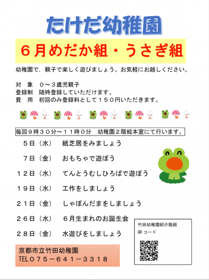 6月のめだか・うさぎ組 公開日 2024/05/31 更新日 2024/05/31 めだか・うさぎ組 梅雨の季節になってきました。 雨って濡れて嫌だなと思いがちですが、雨のしずくがきれいだったり、アジサイが生き生きと見えたり、カタツムリが出てきたり…幼稚園では、雨の日も楽しんでいます。 6月の教育相談「めだか組」「うさぎ組」の予定です。 ぜひ、遊びに来てくださいね!