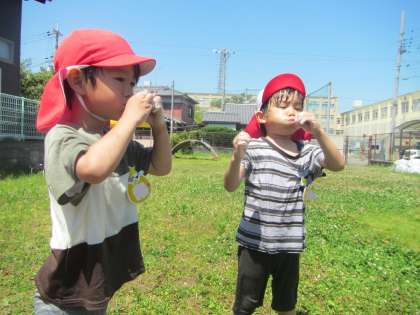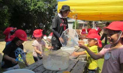 先日、しゃぼたあわお様に「バブルチェーン連玉」や「シャボン玉液」などを寄贈していただきました。頂いたものを使って、3・4歳児の子どもたちがシャボン玉遊びを楽しみました。先生がバルーンチェーン連玉を使ってシャボン玉を飛ばすと、細かいシャボン玉がいっぱいでてきて、シャワーのように降ってくるシャボン玉を見たり、追いかけたりして楽しみました。自分でもシャボン玉をつくってみようと、用具に液をつけて振ってみたり、ふーっと息を吹きかけたりしてシャボン玉を飛ばしていました。大きなシャボン玉ができると、嬉しそうな子どもたちでした。