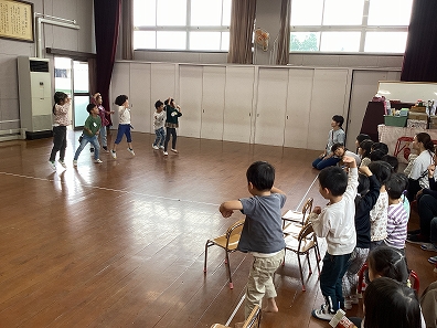 竹田幼稚園の5歳児は、他の幼稚園の友達と一緒に、わらべ歌で遊んだり、ダンスをしたりします。