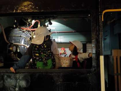 鉄道博物館では、実際に走る蒸気機関車の汽笛を間近で聞いたり、煙が出る様子を見たり、いろいろな機関車や電車に触れたりと、楽しいことが盛りだくさんでした。遊べる機関庫では、「石炭いれまーす」「燃えてきた!」「ポッポー!!」「しゅっぱつしんこう!」とイメージを膨らませながら遊ぶ様子がありました。