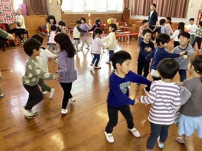 異年齢の交流がより深まればという願いから、今年度は、3学年のグループ「幼稚園家族」をつくっています。その3歳児と4歳児の子どもたちが、遊戯室で仲良し遊びをしています。