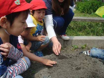 今日はてんとうむし広場の畑を地域の西村さん(保護者でもあります)に小さな耕運機で耕してもらいました。肥料を蒔いた後,ブルンとエンジンをかけ,次々に畑を耕してくださいました。耕した後の土の色の違いに気付く子どもたちが多く,「なんで色が変わるの?」と質問していました。「土の中には水分が含まれているから,混ざると色が変わるんだよ。耕した後の土はふかふかだよ」と教えていただきました。触ってみると本当にフカフカでいい気持ち。みんなでお礼を言うと「野菜をおいしく食べる子どもになってね」と子どもたちに声をかけてくださいました。とてもいい経験ができました。本当にありがとうございました。明日は耕してもらった畑に夏野菜の苗を植えます。みんなで植えてお世話しようね。おいしい野菜ができるといいね。