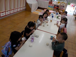 お弁当がはじまったよ! 公開日 2025/05/02 更新日 2025/05/02 幼稚園では・・・ 先週の木曜日から、ちゅうりっぷ組の子どもたちもお弁当が始まりました。 幼稚園でみんなで食べることを楽しみにしていたようで、「まだ食べないの?」「見て!私のおにぎりこれだよ!」と嬉しそうに見せてくれる子どももいました。みんなで一緒に食べると,より一層おにぎりも美味しく感じられたようでした。 来週もまたみんなで食べるの楽しみだね!