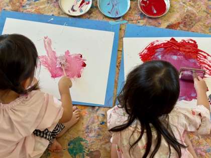 6月5日の幼稚園 公開日 2025/06/05 更新日 2025/06/05 幼稚園では・・・ たんぽぽ組のみなさん、何やら絵具で取り組んでいます。 手で直接ヌタヌタするのも良し、たんぽでポンポンするのも良し、ローラーでゴロゴロするのも良し。思い思いの方法で、絵具の感触、色の混じり合いを楽しみます。 手から伝わってくること、目から伝わってくること、大事に大事に。