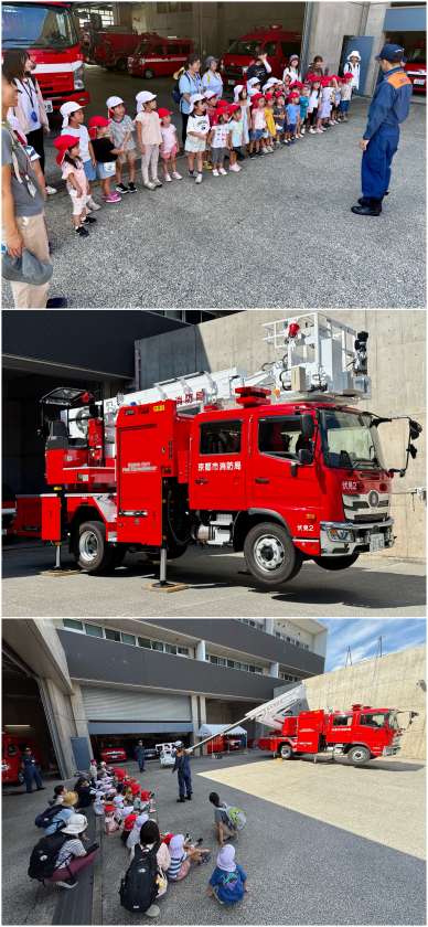 9月3日の幼稚園 公開日 2025/09/03 更新日 2025/09/03 幼稚園では・・・ みんなで伏見消防署の見学に行きました。 最新式のはしご車がグンとはしごを伸ばす様子は迫力満点。3階まで一気に届きます。 デモンストレーションの後は、クラスごとに分かれていろいろな消防車のお話を聞きました。消防車も隊員のみなさんもかっこよかったね。 伏見消防署のみなさん、ありがとうございました。