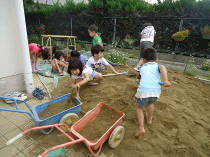 そしてその後,大量の砂を子どもたちと一緒に砂場へ運びました。