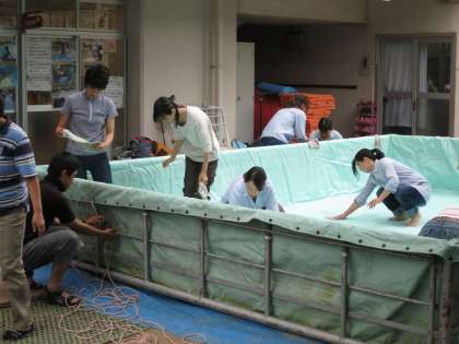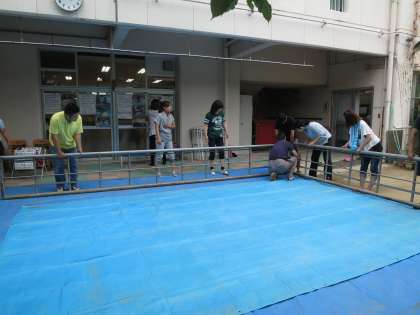 プールができたよ! 公開日 2014/06/18 更新日 2014/06/18 幼稚園では・・・ 今日はお家の人の協力で,園庭にプールを組み立てました。たくさんの方の協力で,あっという間に大きなプールが出来上がり!子どもたちは2階のベランダから見て大喜びでした。明日からのプール遊びが楽しみだね! お忙しい中,子どもたちのためにたくさん手伝っていただいてありがとうございました。