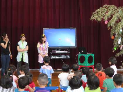幼稚園ではみんなで遊戯室に集まって七夕の集いをしました。
