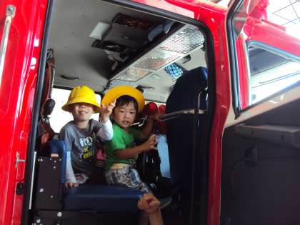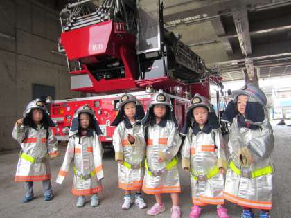 消防署に着くと消防車が4台!!消防士さんに「消防車に触ったり乗ったりしてもいいよ」と言ってもらい,子どもたちは大興奮で消防車の上に登ったり,運転席に座らせてもらったり,消防士さんの服を着せてもらったりなど,たくさんの貴重な体験ができました。ありがとうございました。