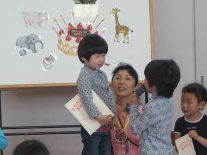 みんなで楽しいパネルシアターを見た後に,誕生日の子どもたちはプレゼントをもらったりインタビューをうけたりしました。