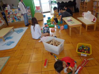 プールを楽しみにして来たうさぎ組のお友だち。絵本室で,積み木やおもちゃで遊んだり,絵本を読んでもらったりして過ごしました。