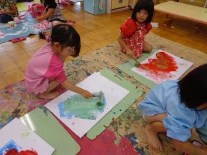 不安定な天候によりなかなかプールに入れない日が続いていますが,絵具で色遊びをしたり,新聞紙をビリビリに破ってパラパラと雨や花火に見立てたり,マントをつくったりして,部屋の中で遊ぶことを思いきり楽しんでいます!