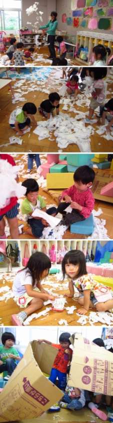 七夕の集会の後は,保育室にいっぱいの落とし紙を雪のように降らせたり,細かくちぎってみたり,かき氷に見立てて遊んだり,雪合戦のようにして段ボール箱の隠れ場所に入り込んだり・・・歓声をあげて遊んでいました。