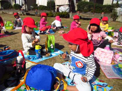 すみれ組やたんぽぽ組が遠足に行っている日,留守番をしているちゅうりっぷ組の子どもたちから「遠足にいきたいなぁ」という声が聞かれました。それではと「じゃあ,てんとうむしひろばへお弁当を持って遠足に行こうか」と提案すると「うん,行きたい」「遠足やね」とすぐに賛成の声があがりました。今日は待ちに待ったてんとうむしひろばの遠足に行きました。初めて,自分でシートを広げての外でのお弁当です。先生がするのを見て,自分で支度をすると張り切って手を洗いに駆けていく子どもたちでした。遠足のお弁当は,格別だったようです。「遠足のお弁当って,おいしいなぁ」という友達の言葉にみんなうなずいていました。「また,遠足しよなぁ」と次回を楽しみにしている子どもたちでした。