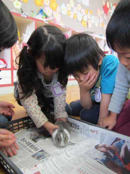 ウサギの赤ちゃんが来ました 公開日 2016/05/06 更新日 2016/05/06 幼稚園では・・・ 隣の小学校で、たくさんウサギの赤ちゃんが生まれました。 その中から、ウサギの赤ちゃんを何匹か分けてもらいました。 今日はすみれ組だけ、ウサギの赤ちゃんに触ったり、抱っこしたりしてかかわりました。 みんな口々に「かわいい」「かわいいなー」と言いながらやさしく触っていました。 来週、みんなで名前を考えたいと思います。かわいい名前を考えてきてね!