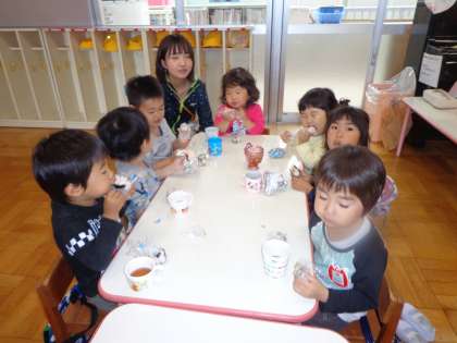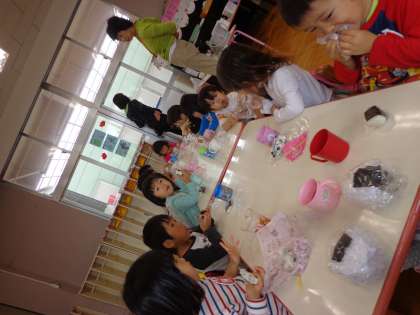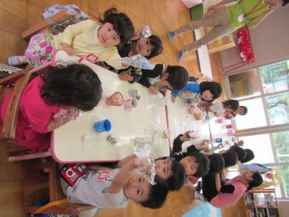 幼稚園に来て,初めてのお弁当日!今日はおにぎり弁当でした。10時過ぎになると「お弁当まだ〜?」,「お腹すいた!」という声が聞こえてきたり,持ってきたおにぎりを見せ合ったり・・・。椅子を準備して,トイレに行って,手洗い,うがいをして,消毒をして・・・待ちに待ったお弁当の時間。みんなで「いただきます」をして,友だちの顔を眺めながら持ってきたおにぎりをモグモグと美味しそうに食べていました。