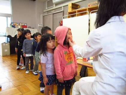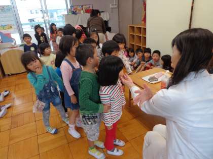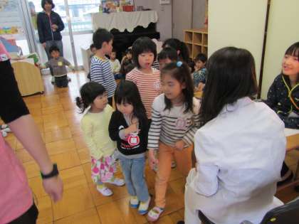 今日は眼科検診がありました。ちゅうりっぷ組の子どもたちはすみれ組のお兄さんお姉さんと手をつないで絵本室に行き,お友だちや先生に見守られながらはじめての眼科検診を,無事終えることができました。すみれ組のみんな,ありがとう。たんぽぽ組の子どもたちは,今年は誰も避けることも泣くこともありませんでした。1年間ですごく成長したね!